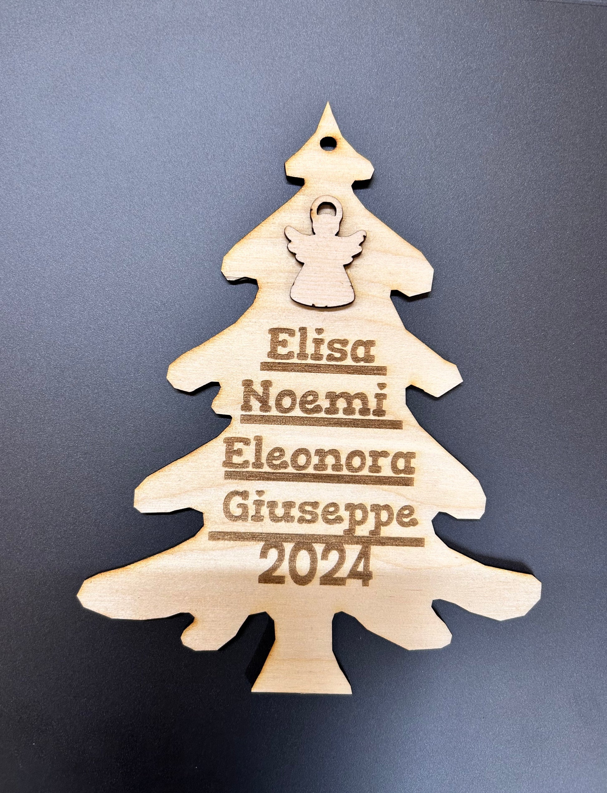 addobbo alberello in legno personalizzato con i nomi e angioletto in rilievo
