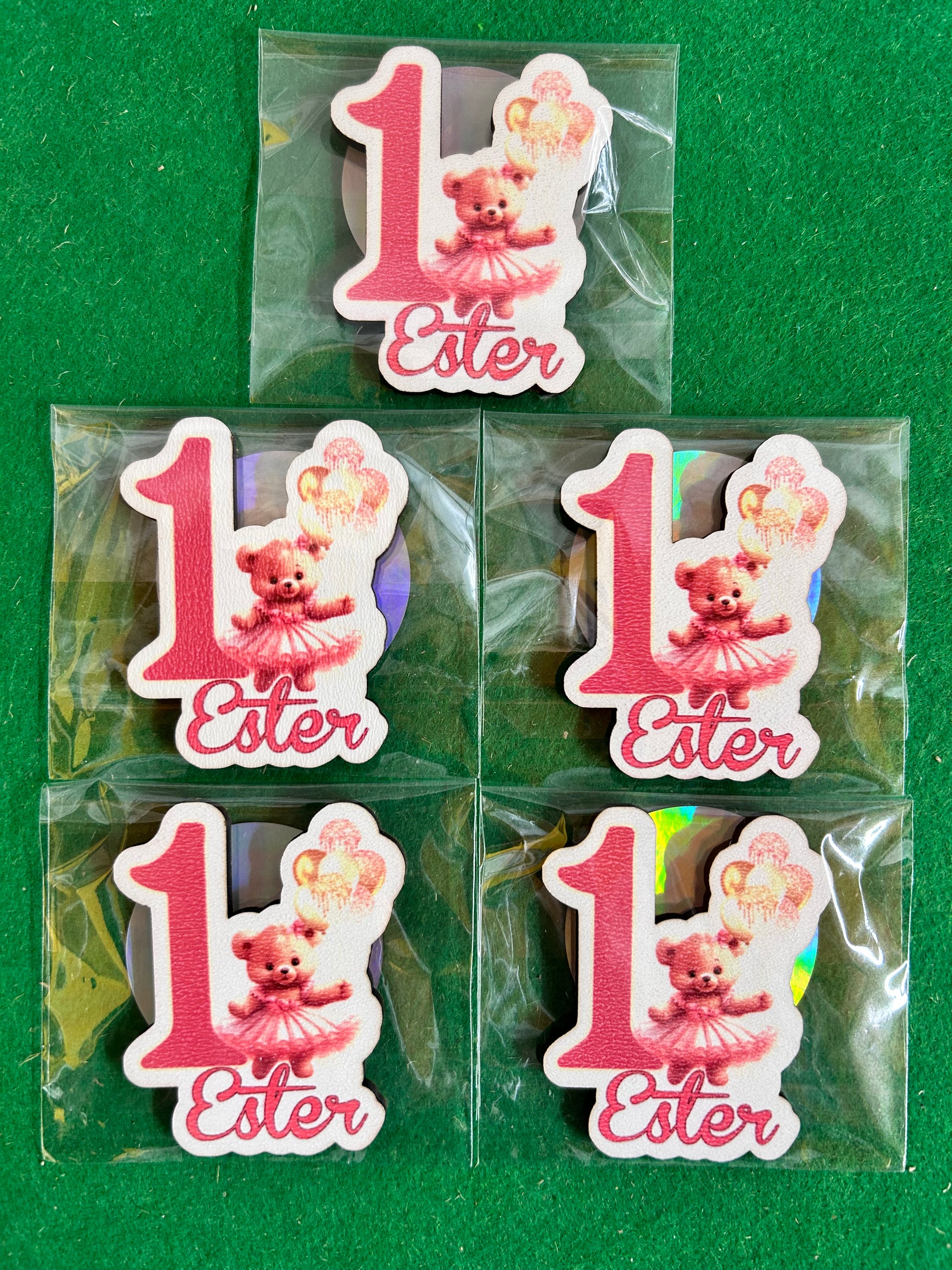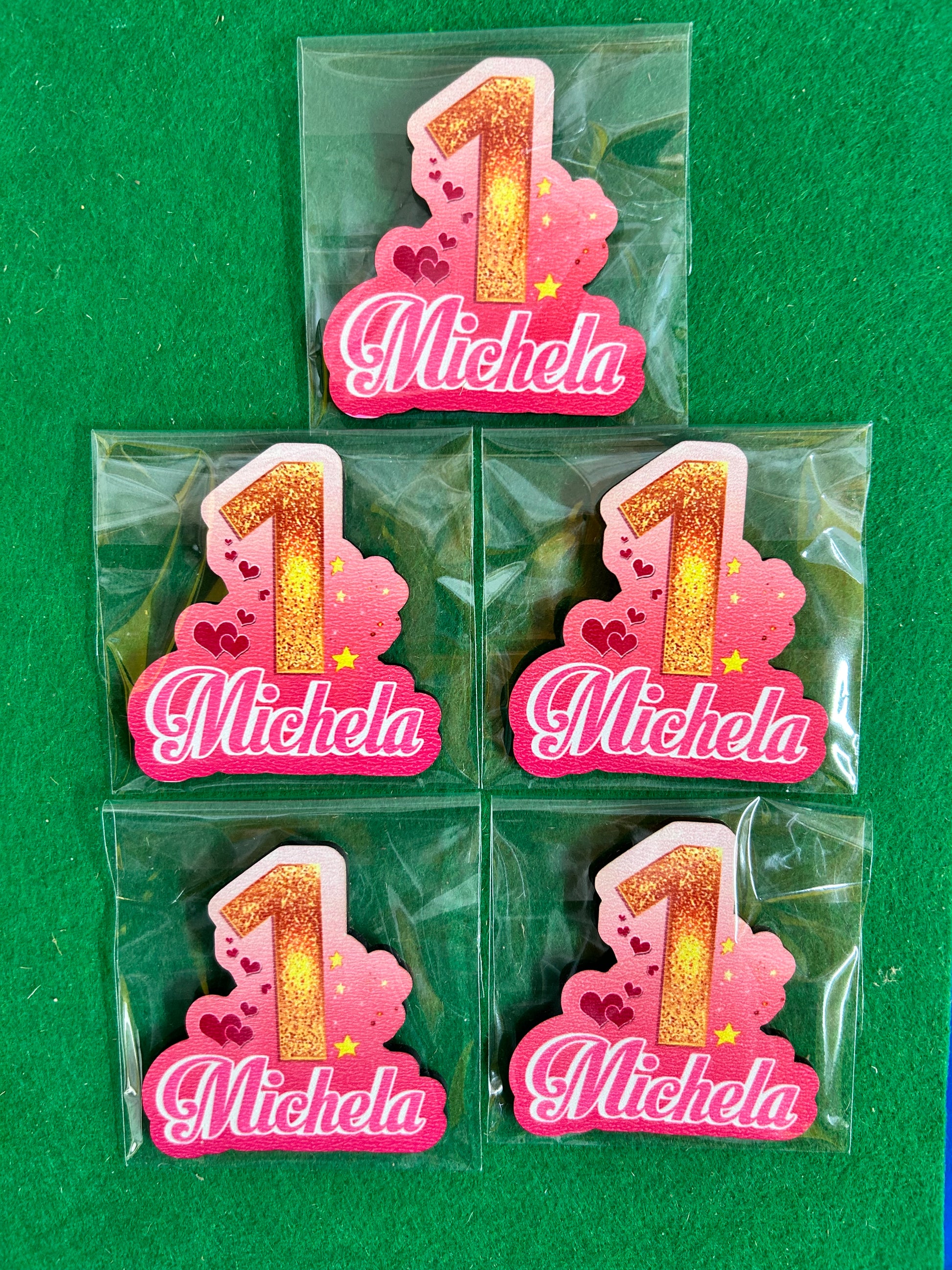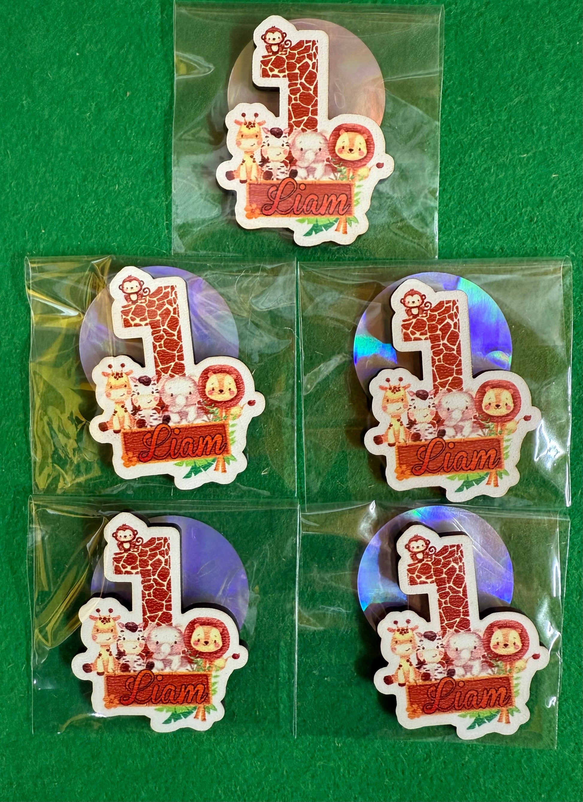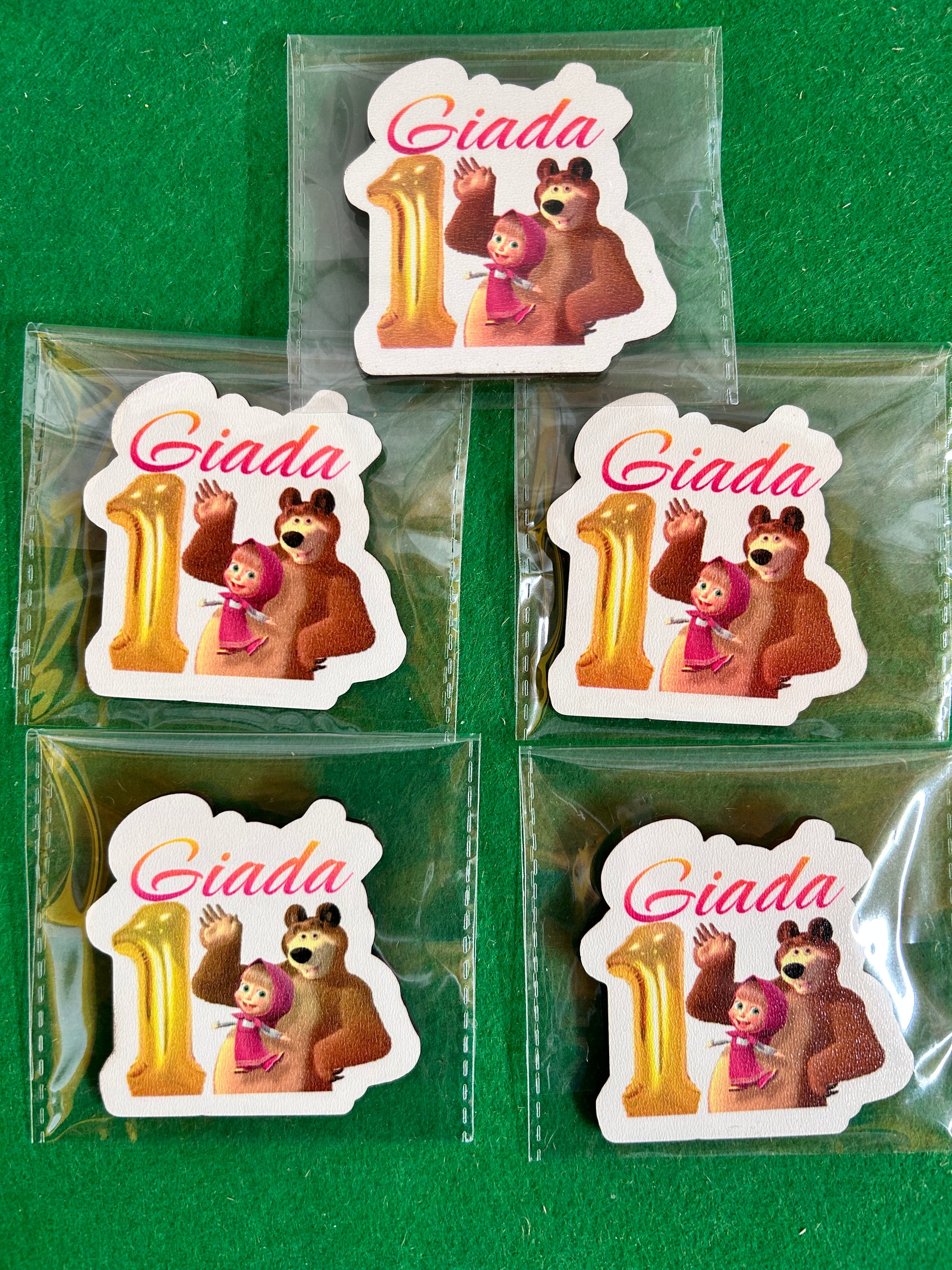 Calamita realizzata in legno e personalizzata con nome e numero. Confezionate una ad una in bustina trasparente.