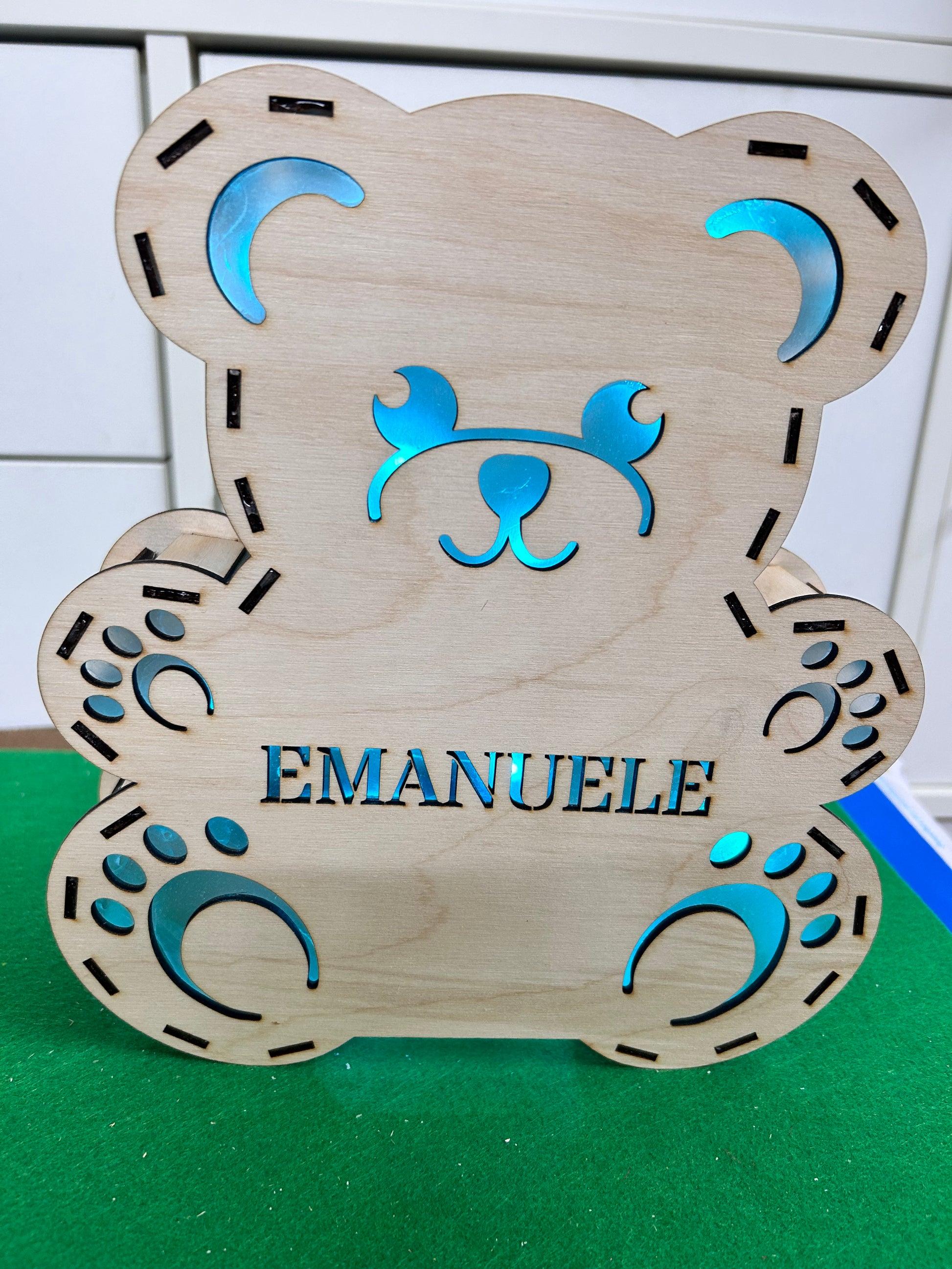 Lampada Orsacchiotto in legno artigianale, personalizzabile con nome. Luci RGB a led multicolori con telecomando, timer personalizzato spegnimento automatico, alimentazione con cavo USB